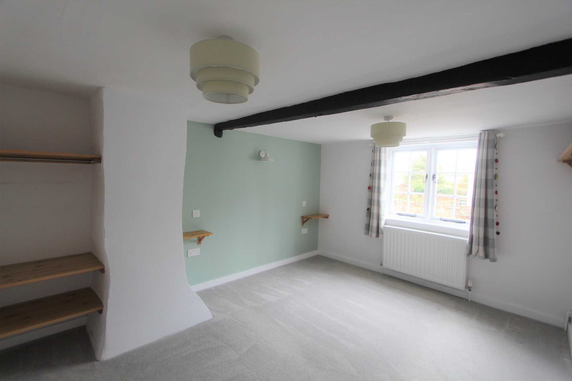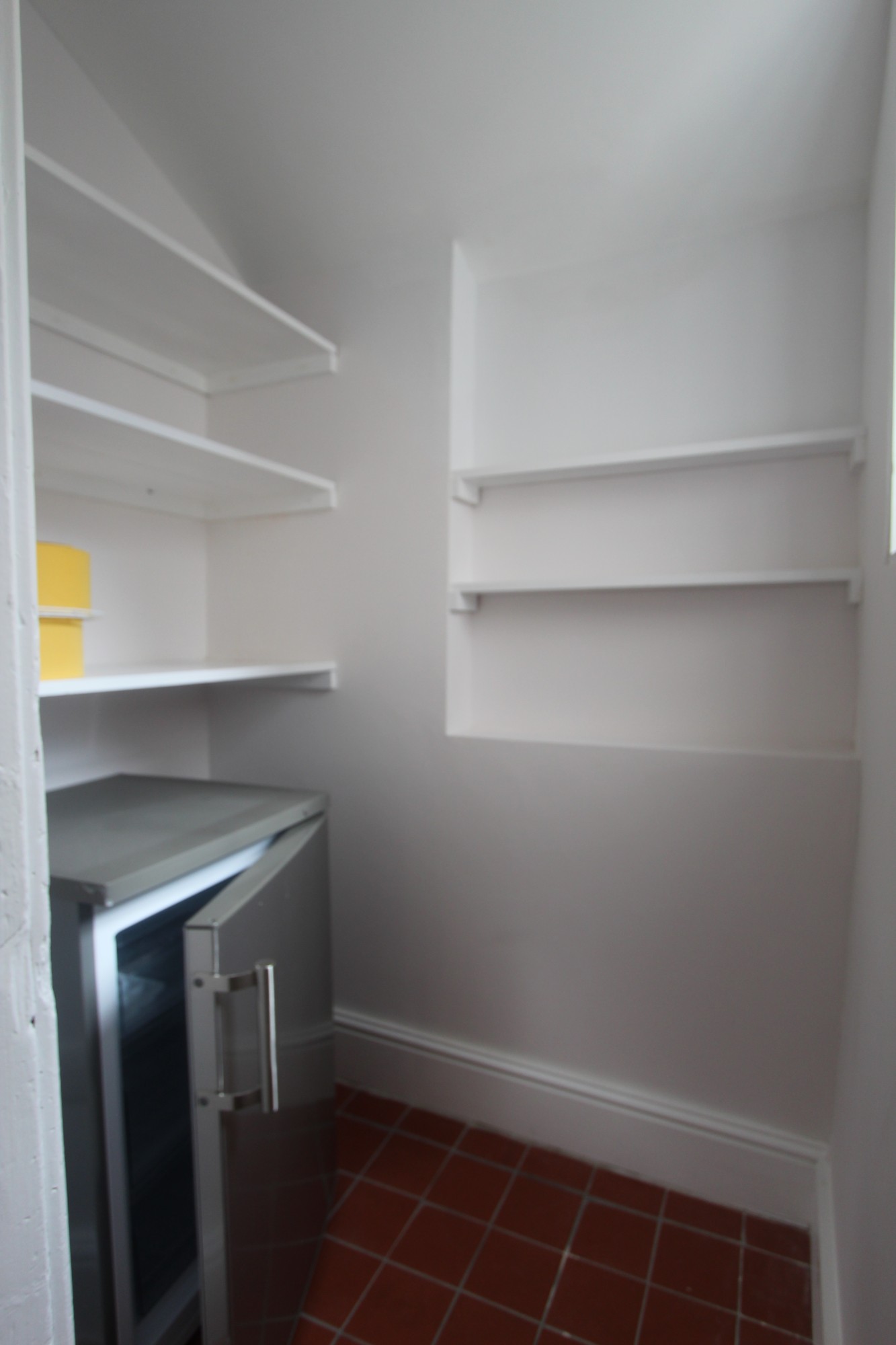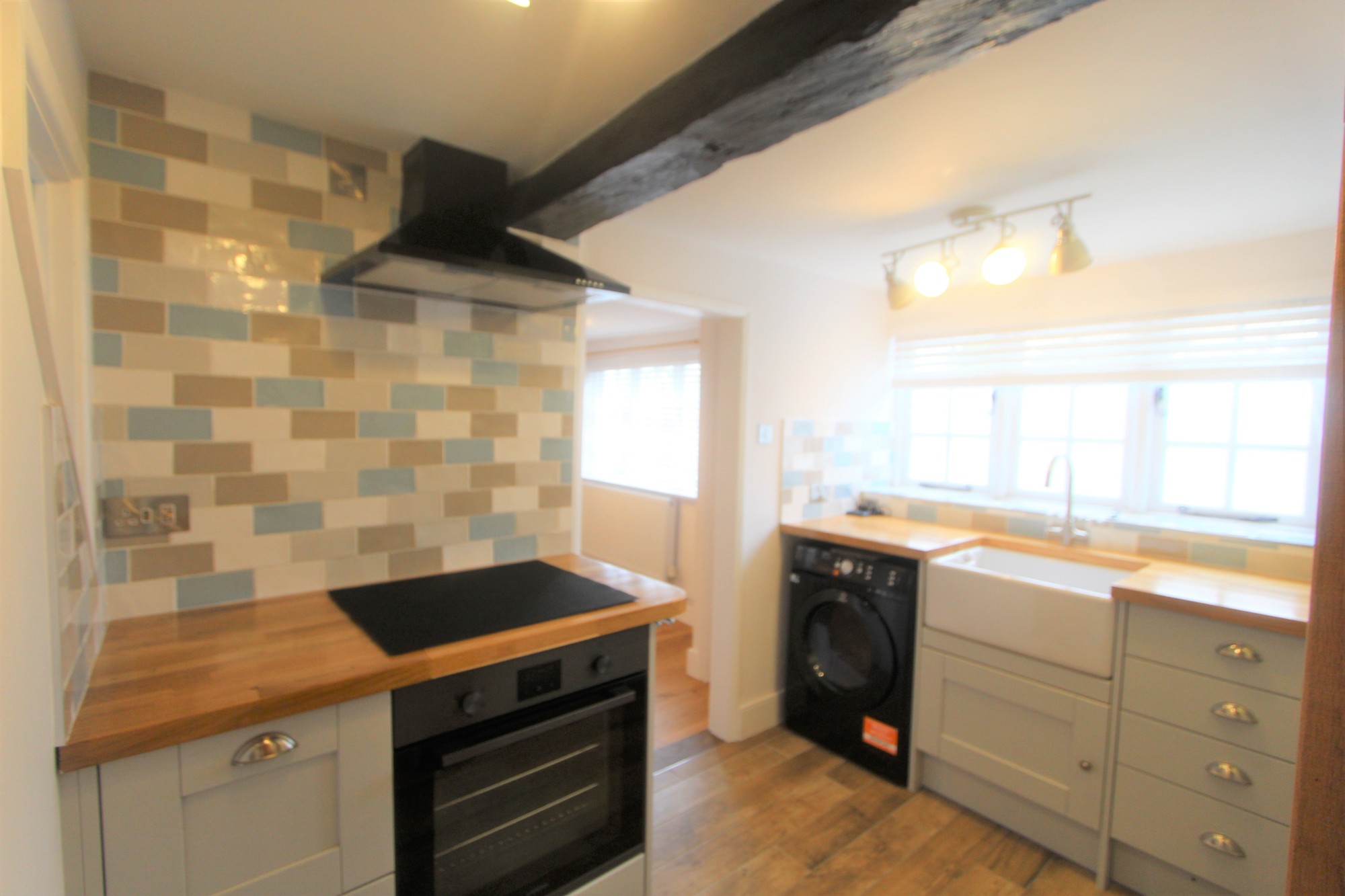 Casement windows overlooking the courtyard garden and stairs leading to first floor. Stripped Victorian door, wood floor, exposed original beams and original bread oven ‘nook’. Boiler cupboard.